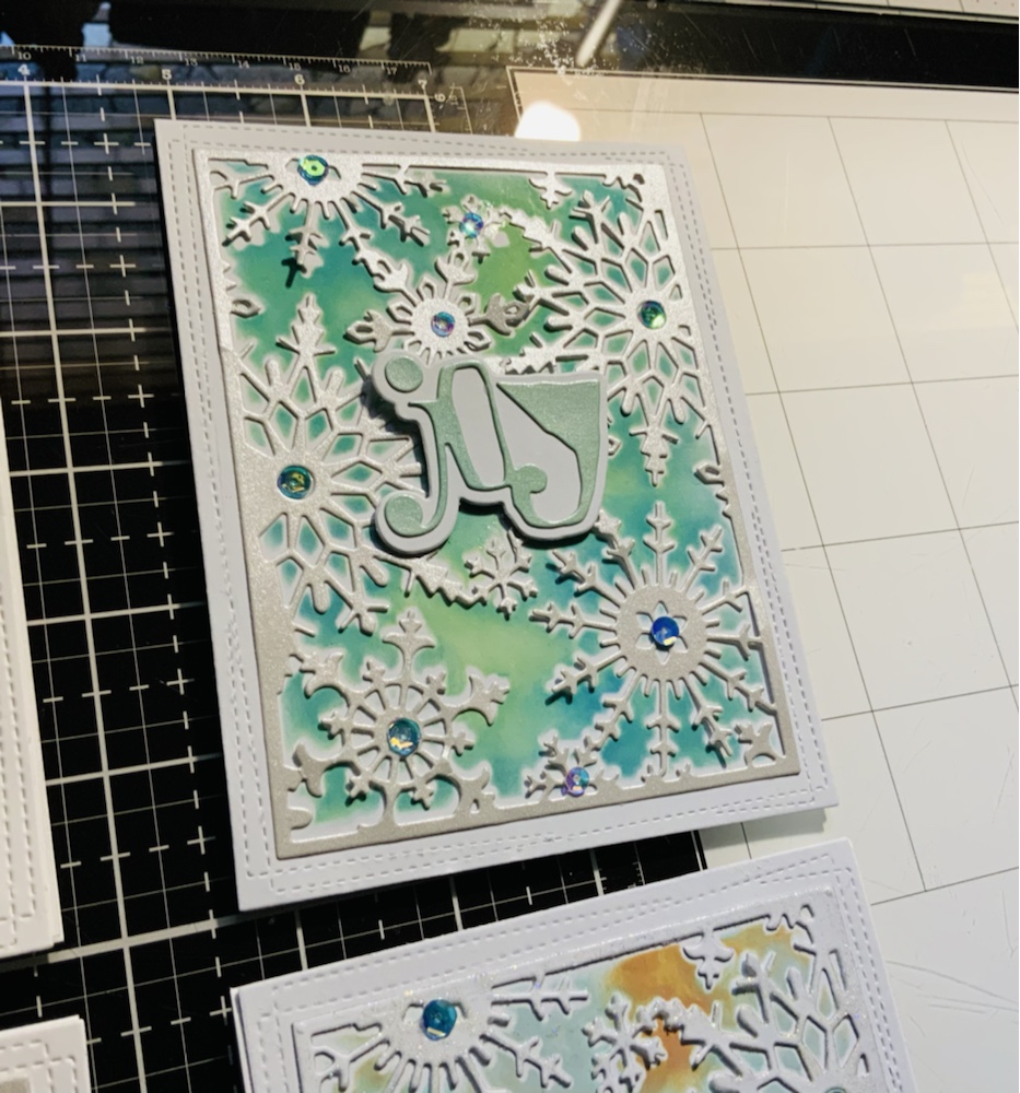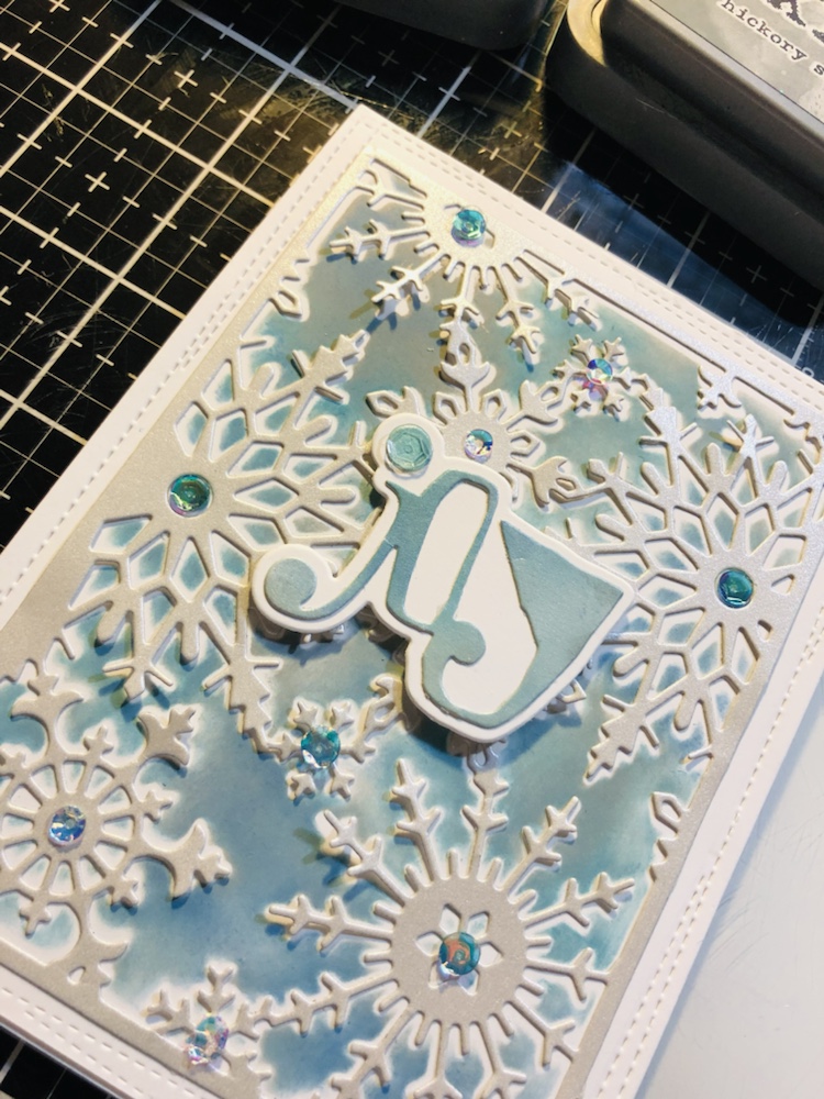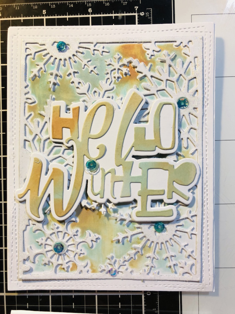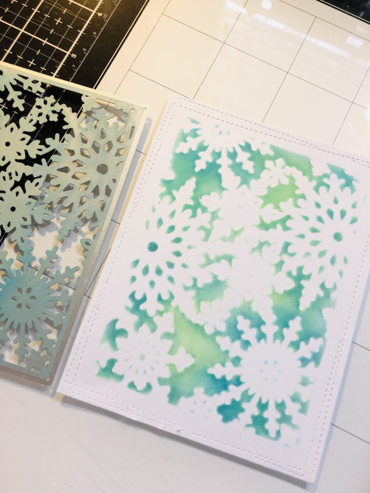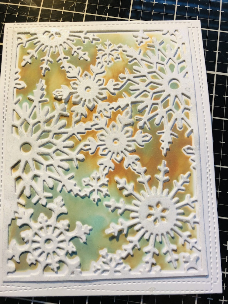 I found this Snowflake Die on Amazon, fell in love with it and so I purchased it. I also found a couple more dies too and purchased them. When I make more Christmas I’ll post them. I took the snowflake die, tape it down on water color paper and used it like a stencil. Took Tim Holtz distress oxides salvaged patina, wild honey and specked egg, blended the colors together. I love the look I got when I lift the die up.
