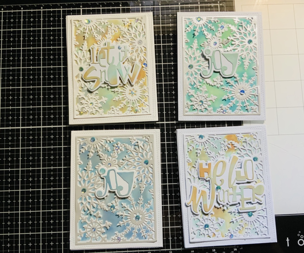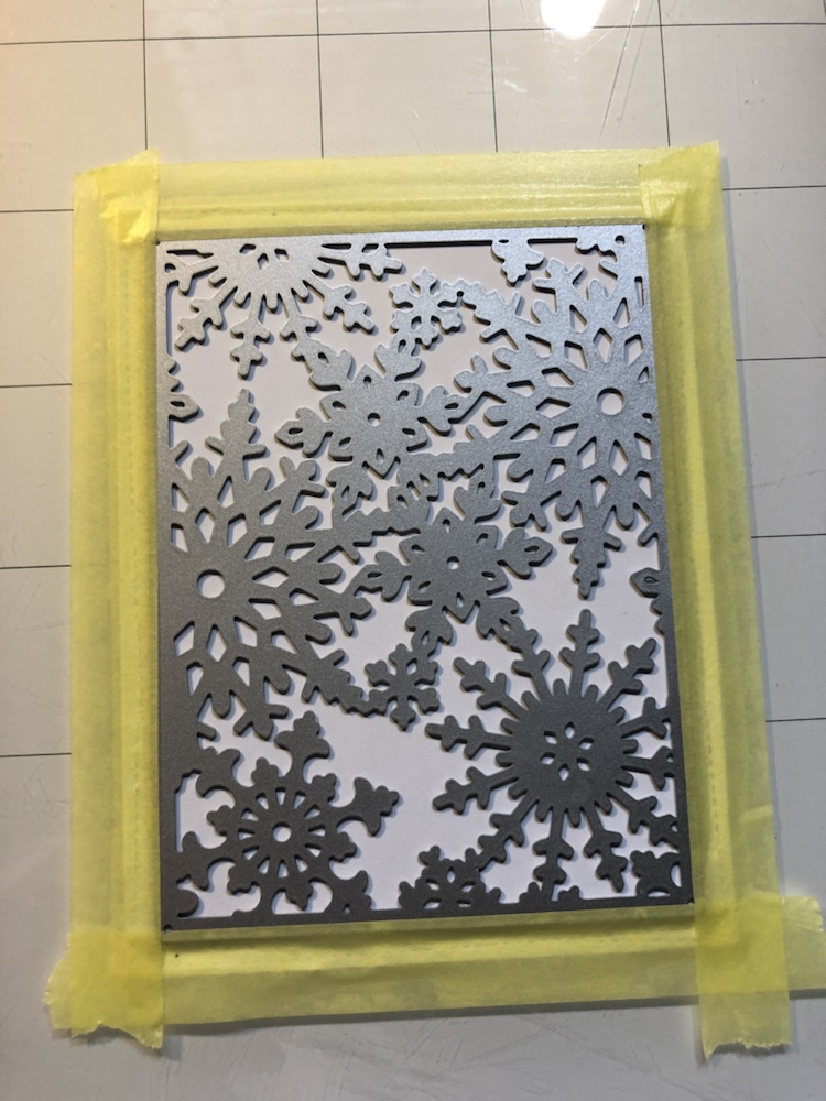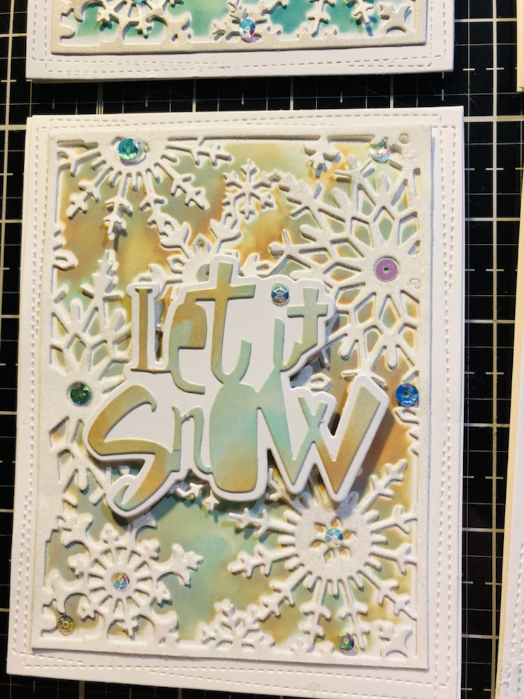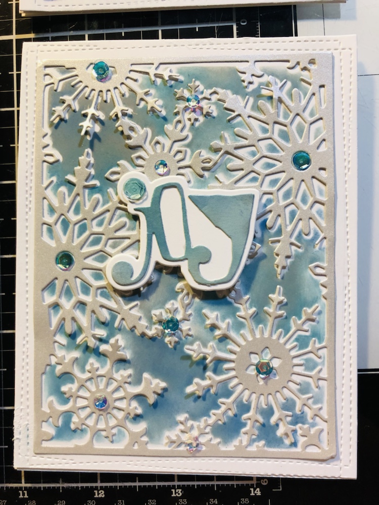 I found this Snowflake Die on Amazon, fell in love with it and so I purchased it. I also found a couple more dies too and purchased them. When I make more Christmas I’ll post them. I took the snowflake die, tape it down on water color paper and used it like a stencil. Took Tim Holtz distress oxides salvaged patina, wild honey and specked egg, blended the colors together. I love the look I got when I lift the die up.