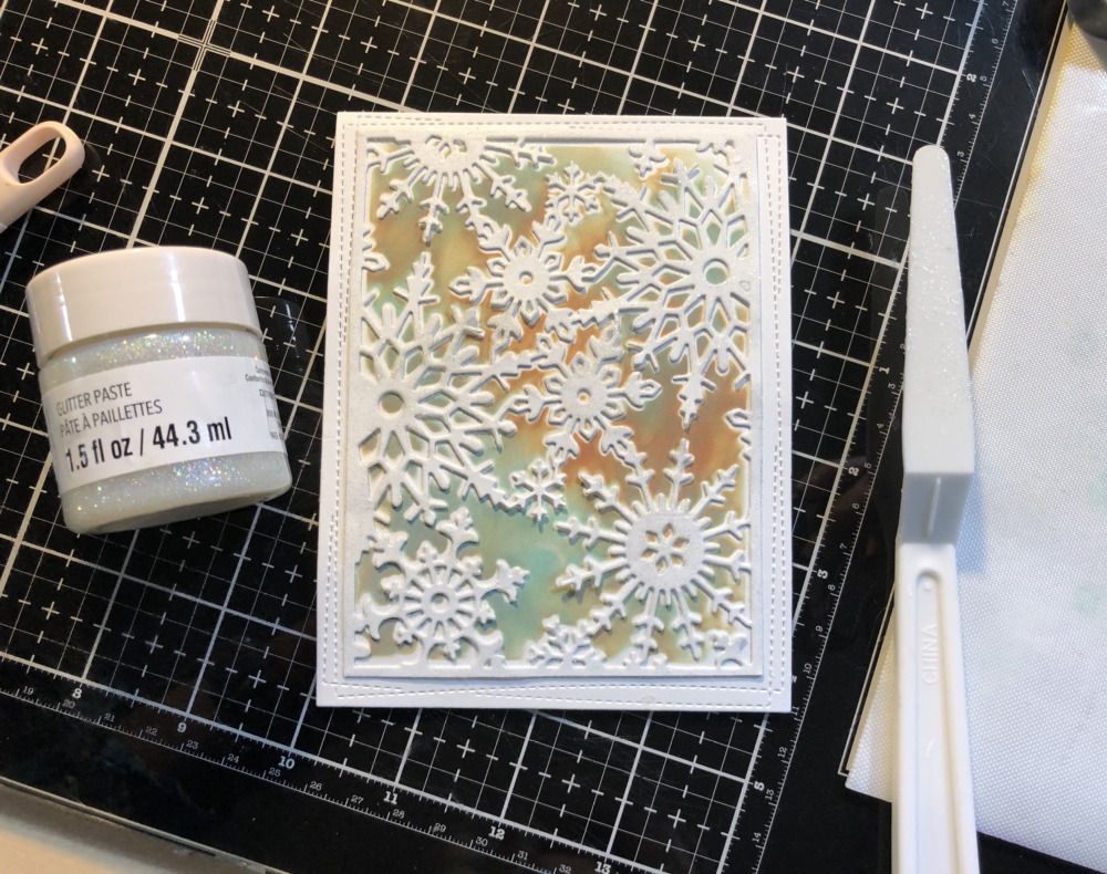 I also took the snowflake die and ran it thew my vagabond, cut out two snowflakes on 110 white card stock. Then I used recollections glitter paste and cover the snowflakes. The glitter paste gave it a beautiful shimmer look to my snowflakes. I let air dry. Once dried I glue my snowflakes cut out to my background.