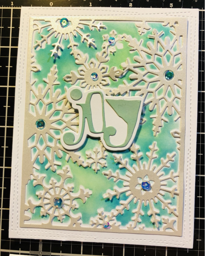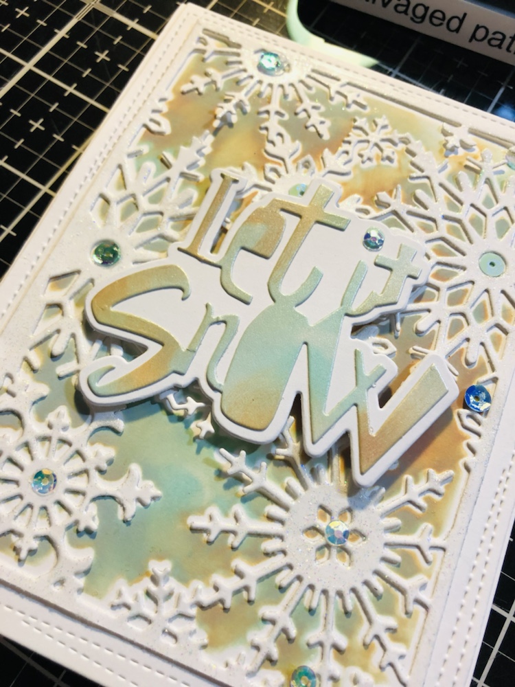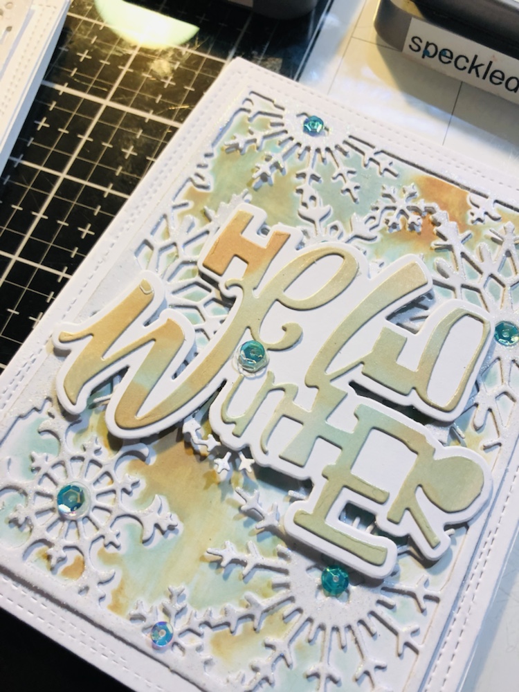 Took Tim Holtz Thinlits set called Festive words #667775 cut out on some shimmer paper and blended the same distress oxide colors I used on background. Add some sequin mix from Picket fence studios Spring fling SQ-129 to my card.