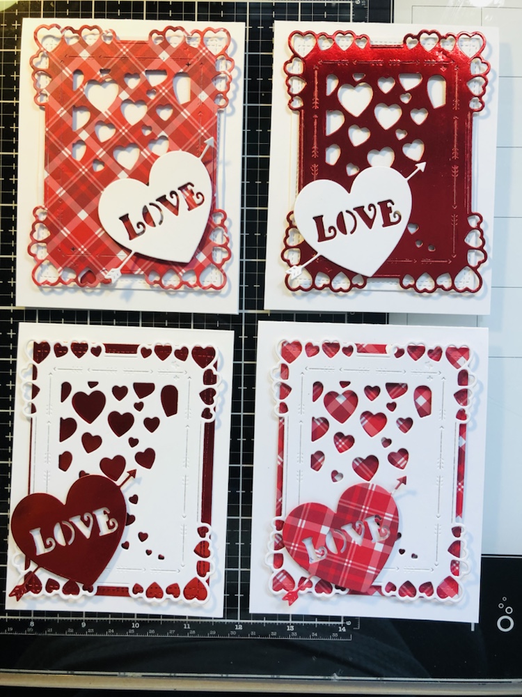 Hello my crafty friends! Hope everyone is having a wonderful day. Today I decided to make a few Valentine’s Day cards. The other day I was on Amazon looking at some Valentine die and card-stock. I found a couple of things I like. Here are the four cards I made using my new die I purchased from Amazon.