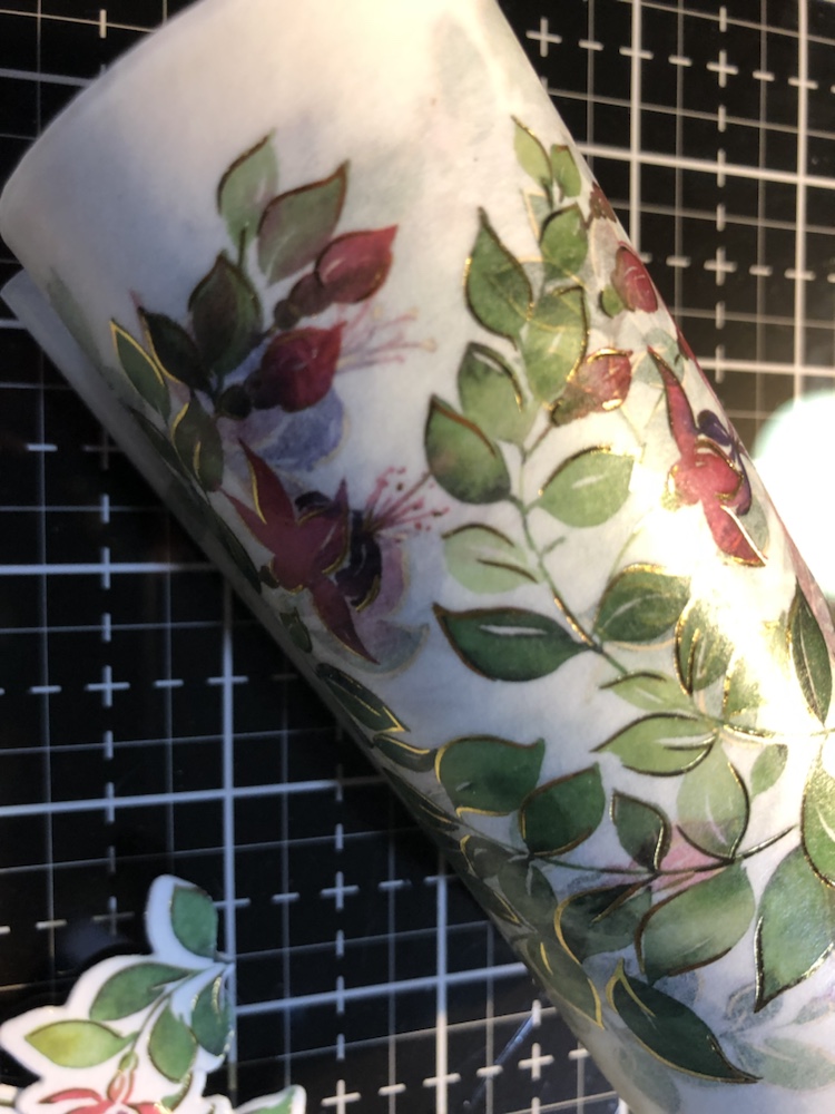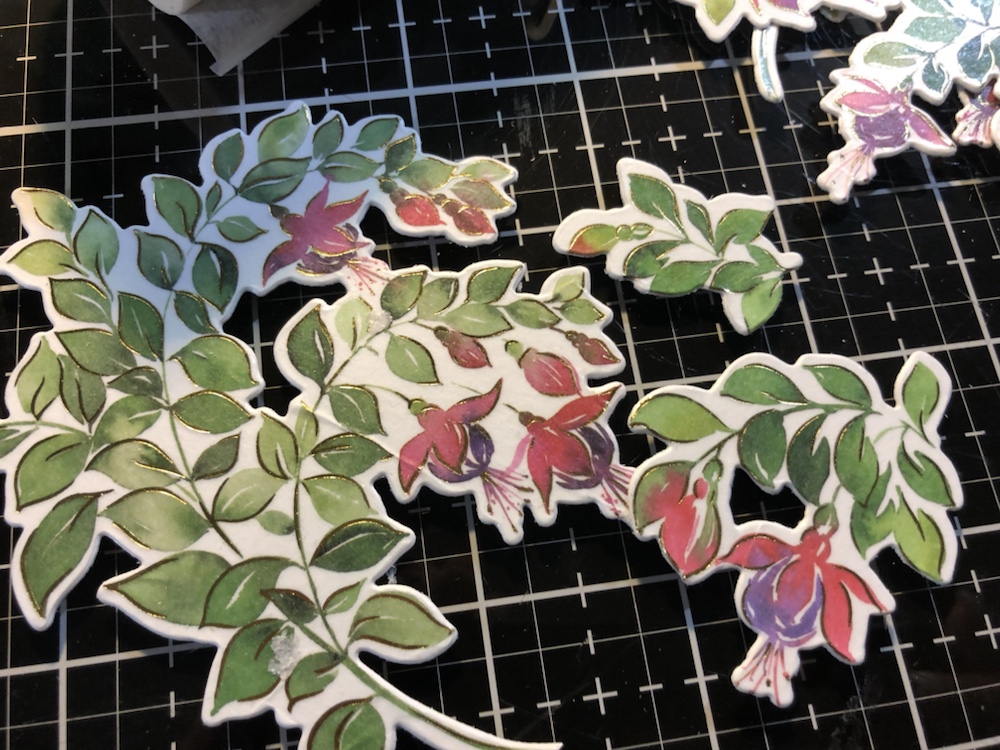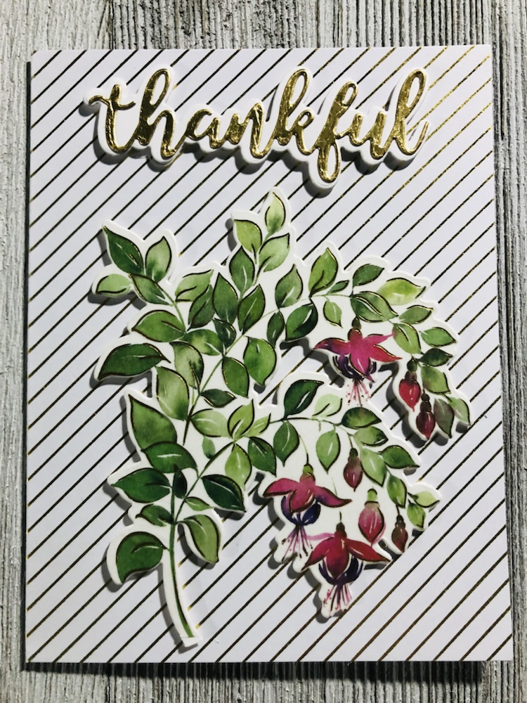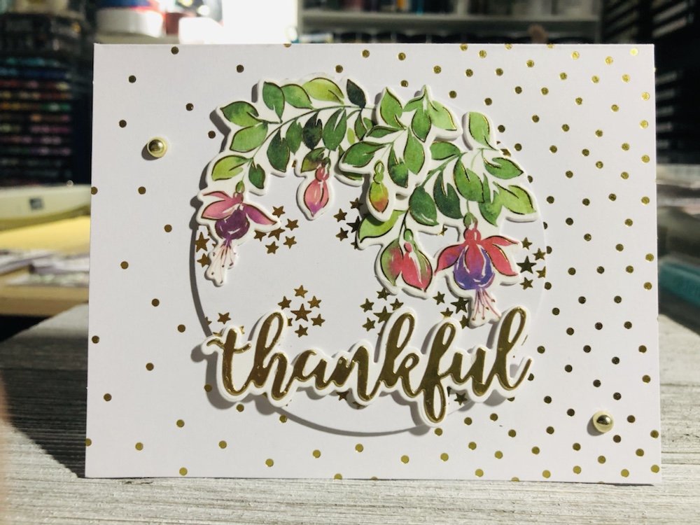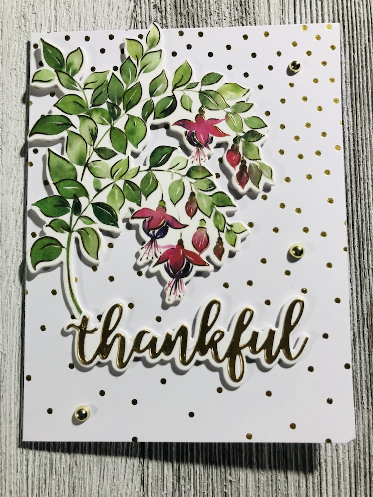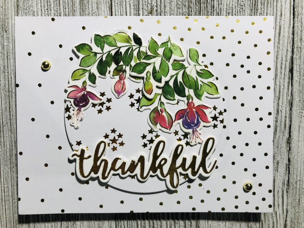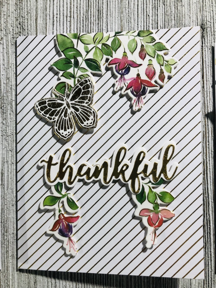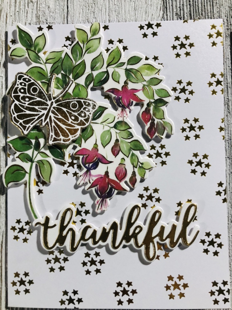Products used Pinkfresh studio Fuchsias stamp, die and washi tape. And Pinkfresh hot foil plate called small butterflies with gold foil. Also Simon Says stamp! Thankful die and Tim Holtz metallic card stock.