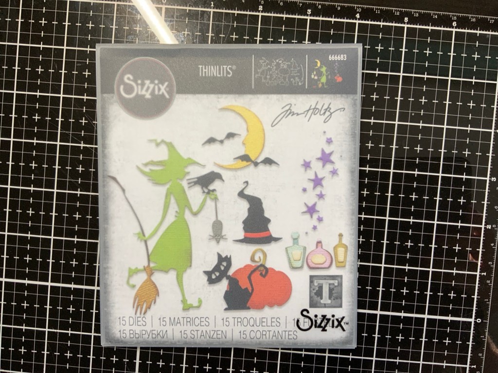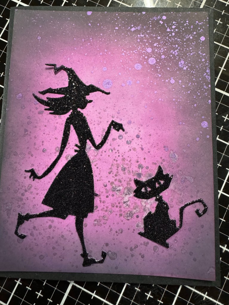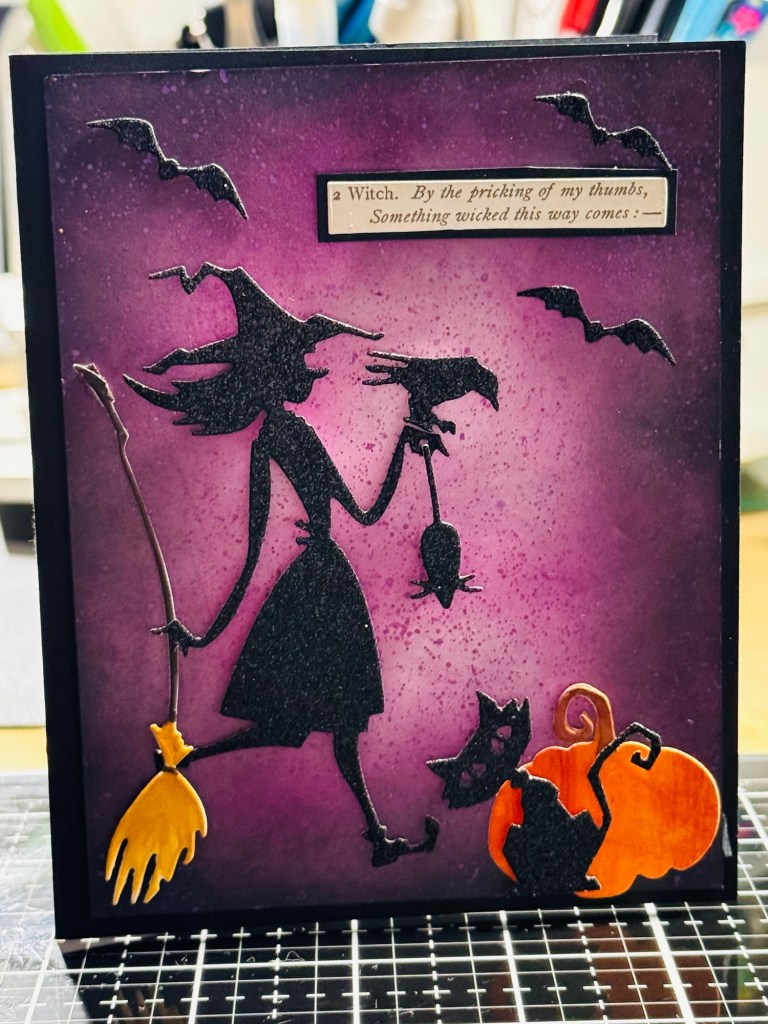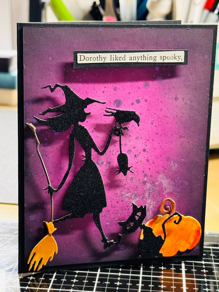 Halloween cards!Dorothy likes anything spookyWitch. By the pricking of my thumbs, something wicked this way comes:What Happened That Night I used Tim Holtz new Thinlits call Vault Wicked #666683. The witch’s, cats, rats, bats and birds were cut out of 110 black glitter card stock. The broom was cut out of 110 white card stock and color with Altenew Artist Marker’s Y823 paper bag, Y762 Expresso and y316 Honey Drizzie. The pumpkin was done with Copic markers YR04, YR68 and E99. Background I blended together are Tim Holtz distress Qxide seedless preserves, , villainous potion and black soot. Also took his new distress spritz wilted violet and splash it on my background and it gave a beautiful shimmer look.