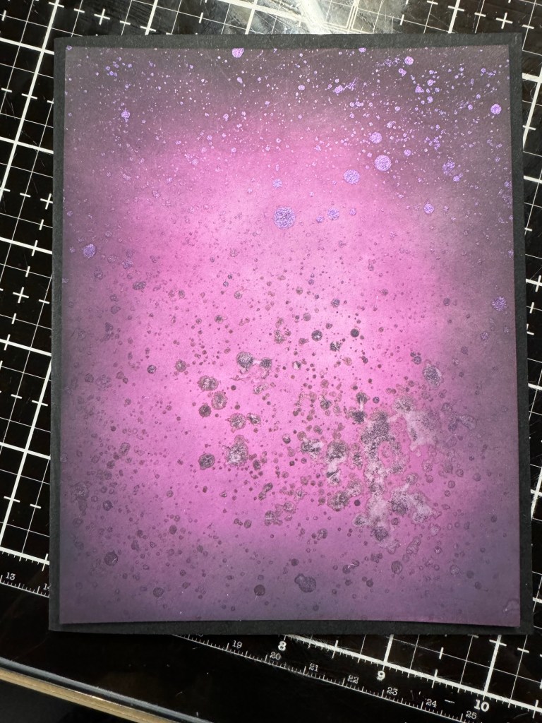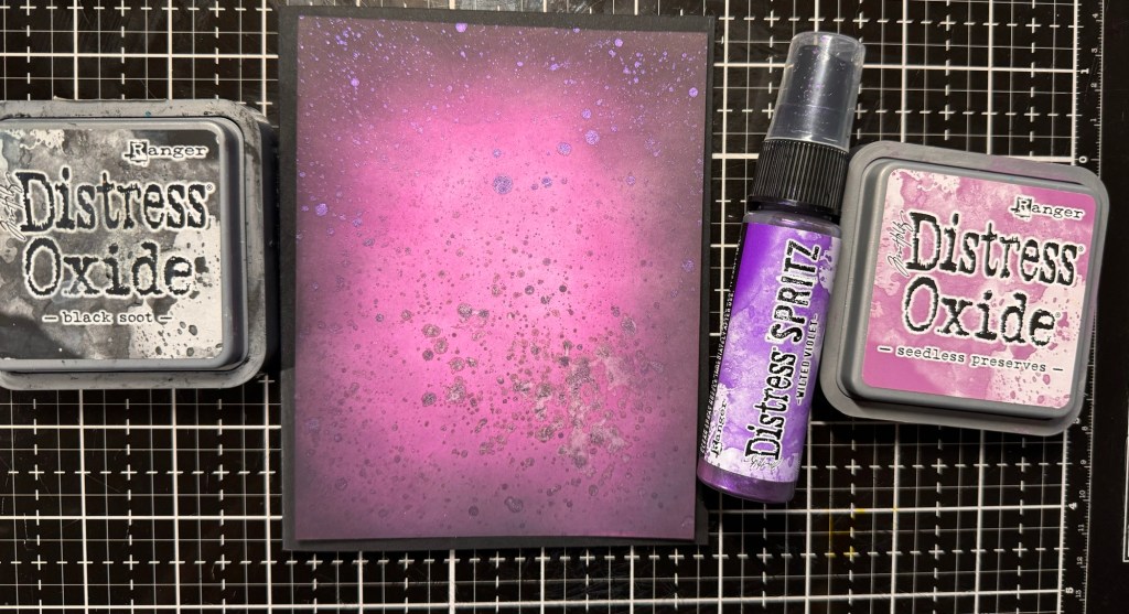 The background in the middle I used Tim Holtz distress oxide seedless, preserve, and black soot. I blended the colors together but first I used Seedless preserves and cover 110 white card stock. And then took black soot and blend all around the edges and sides of my card stock. I took tim holtz new distress spritz and splatter the background. Once dry, it gave it a shimmery look.