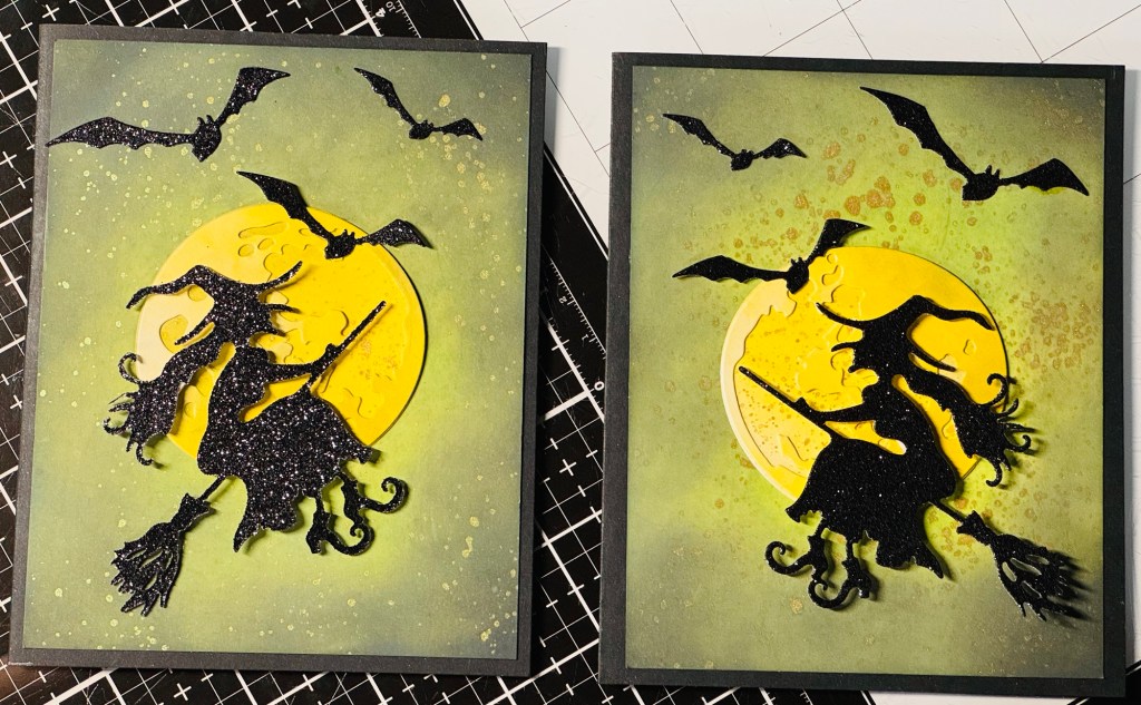 Her eyes were dark.Watching And WaitingI love the way these two cards came out. The background was done with distress oxide twisted citron, mowed lawn and rustic wilderness. Moon was blended with squeezed lemonade and mustard seed. Plus I used distress spritz twisted citron and fossilized amber splashed it on the moon and the background .I used Tim Holtz thinlits called Moonliight #666386 and Spellbinders witch on broom die set. Cut her out with 110 black glitter card stock and bats.