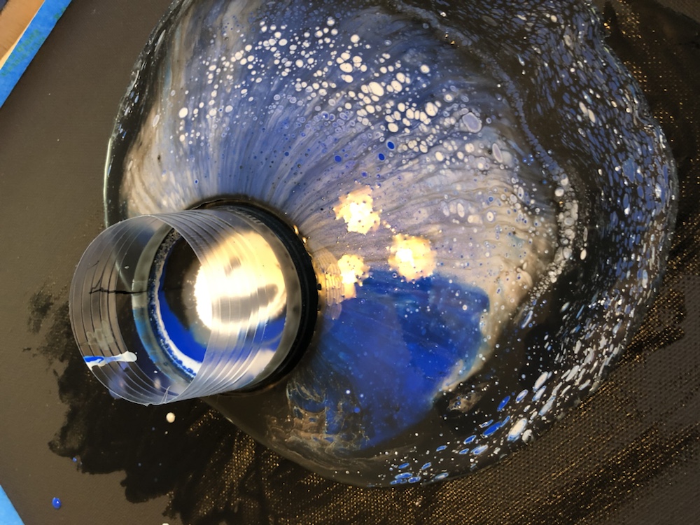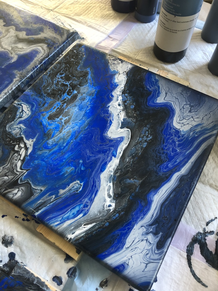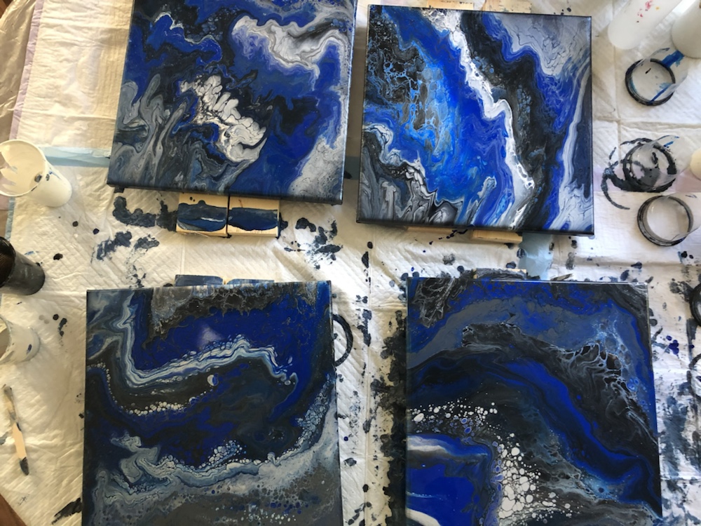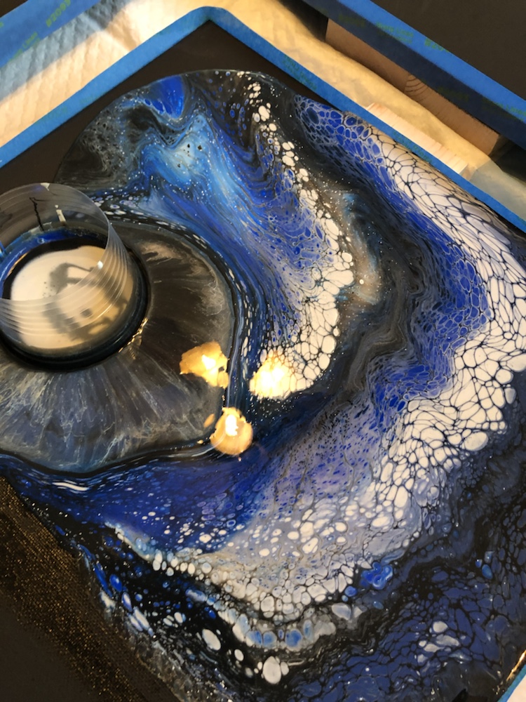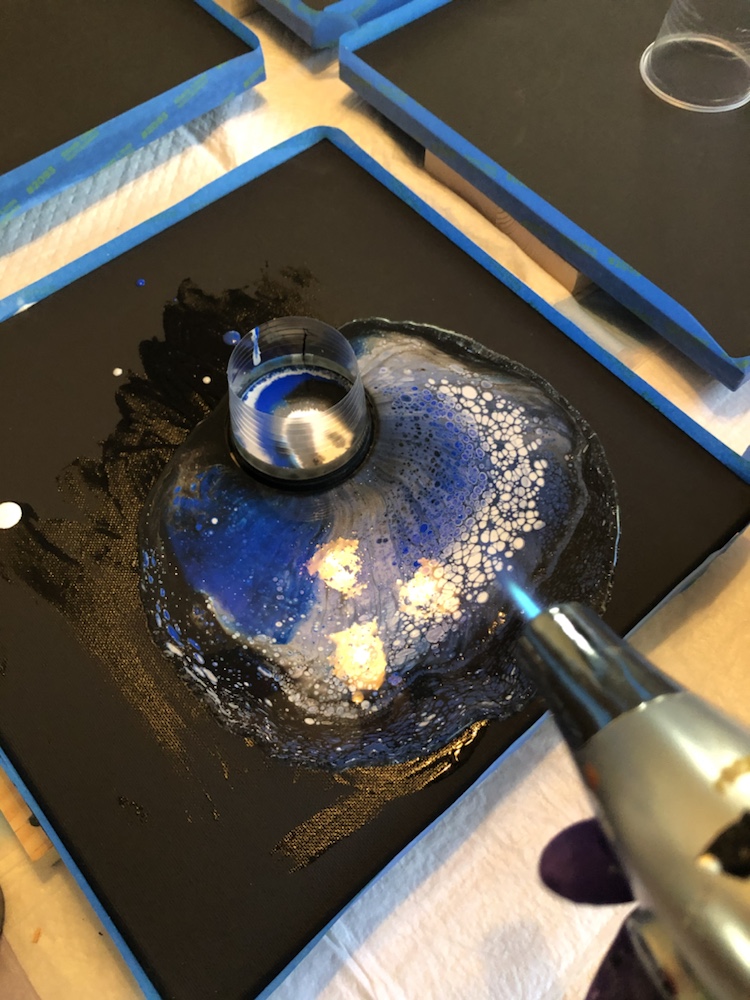 Remove cup and then move your canvas around slowly once cover completely take tape off and watch paints flow over canvas. Then take torch gun again and pop any bubbles. Continue this process on all four canvas.