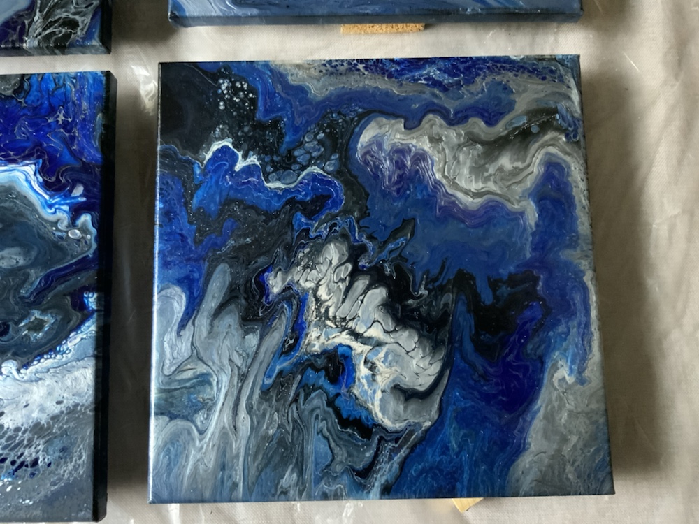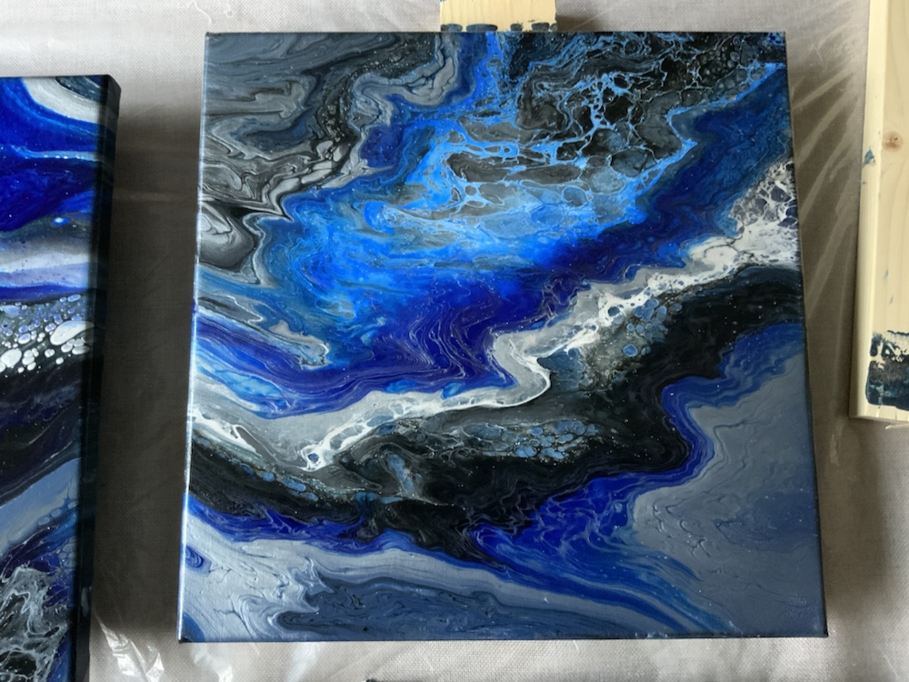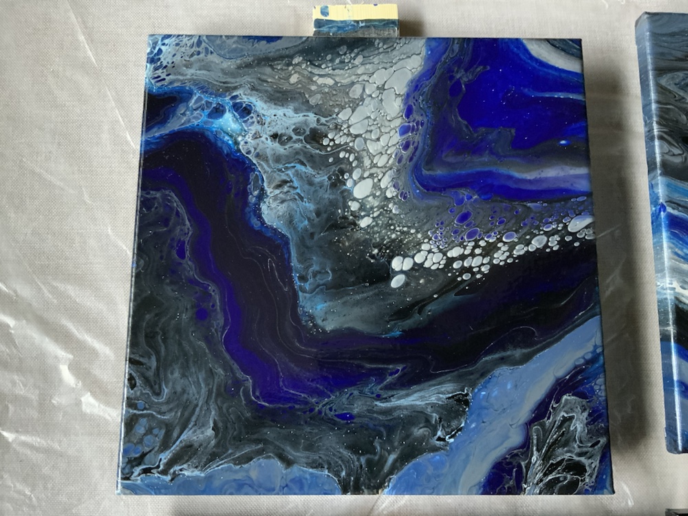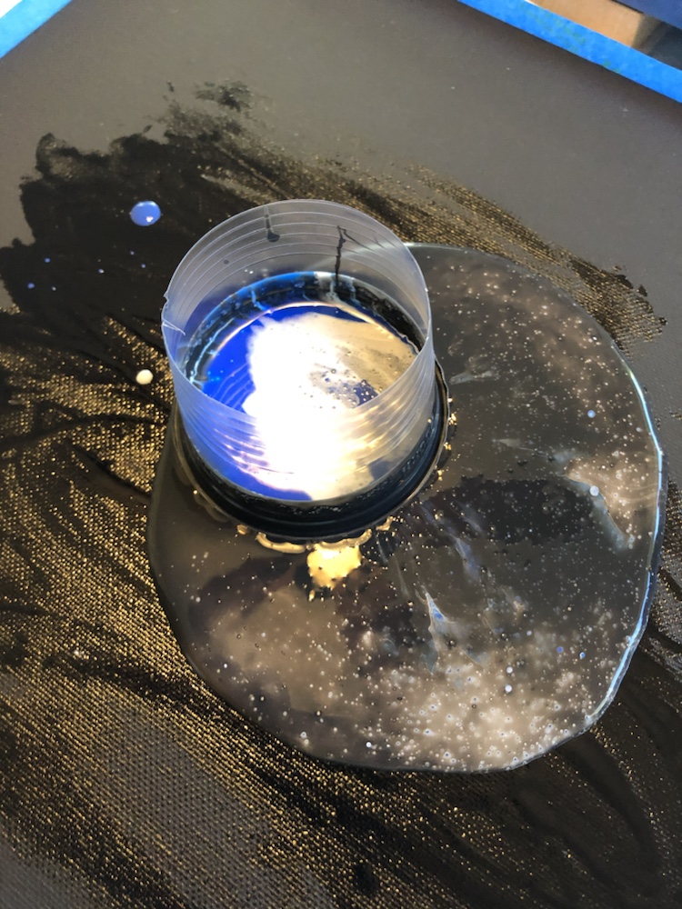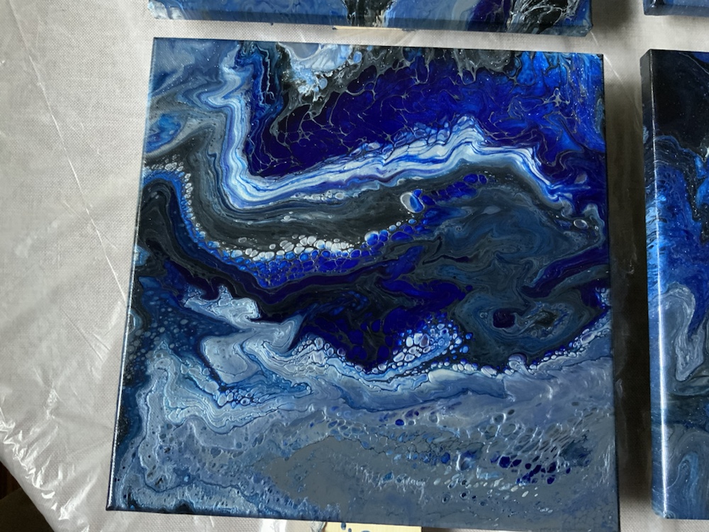 Remove cup and then move your canvas around slowly once cover completely take tape off and watch paints flow over canvas. Then take torch gun again and pop any bubbles. Continue this process on all four canvas.