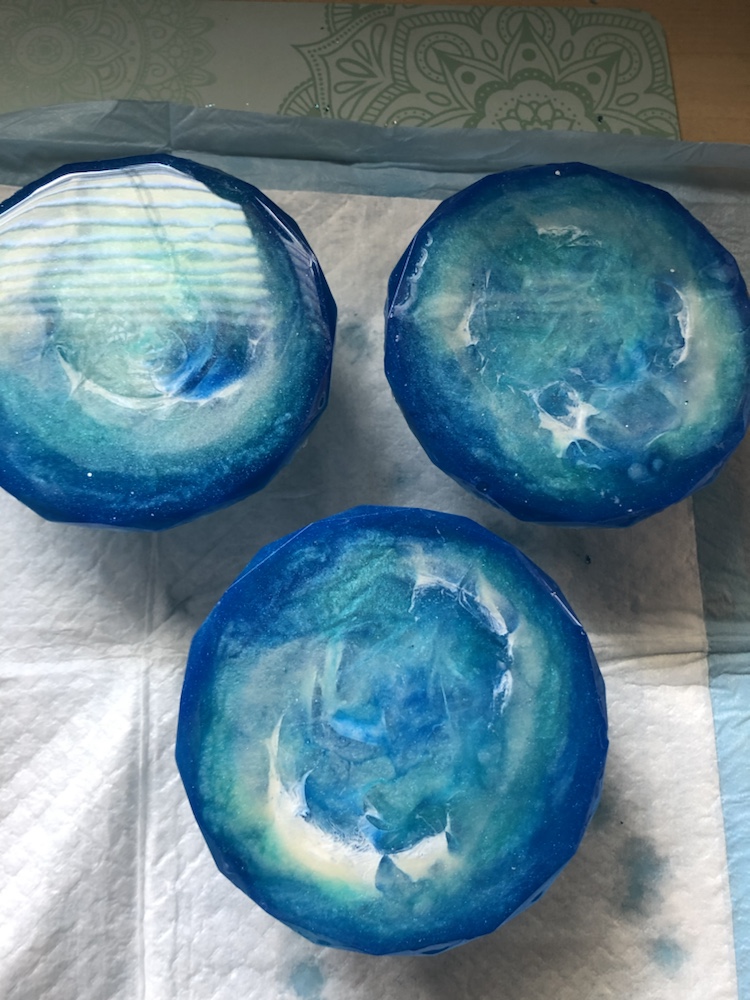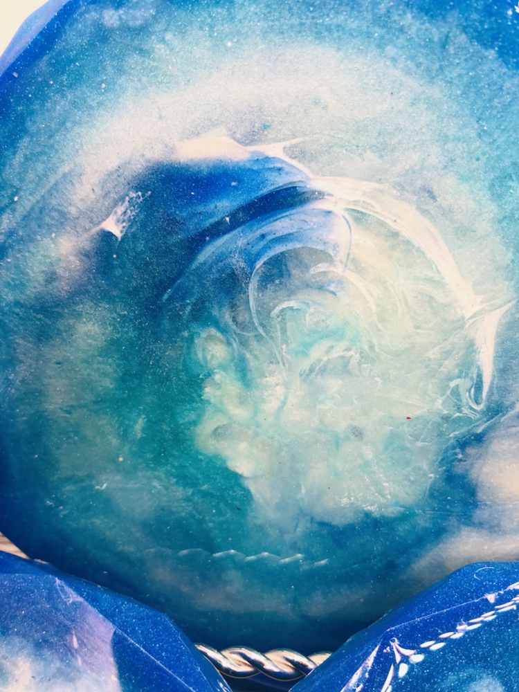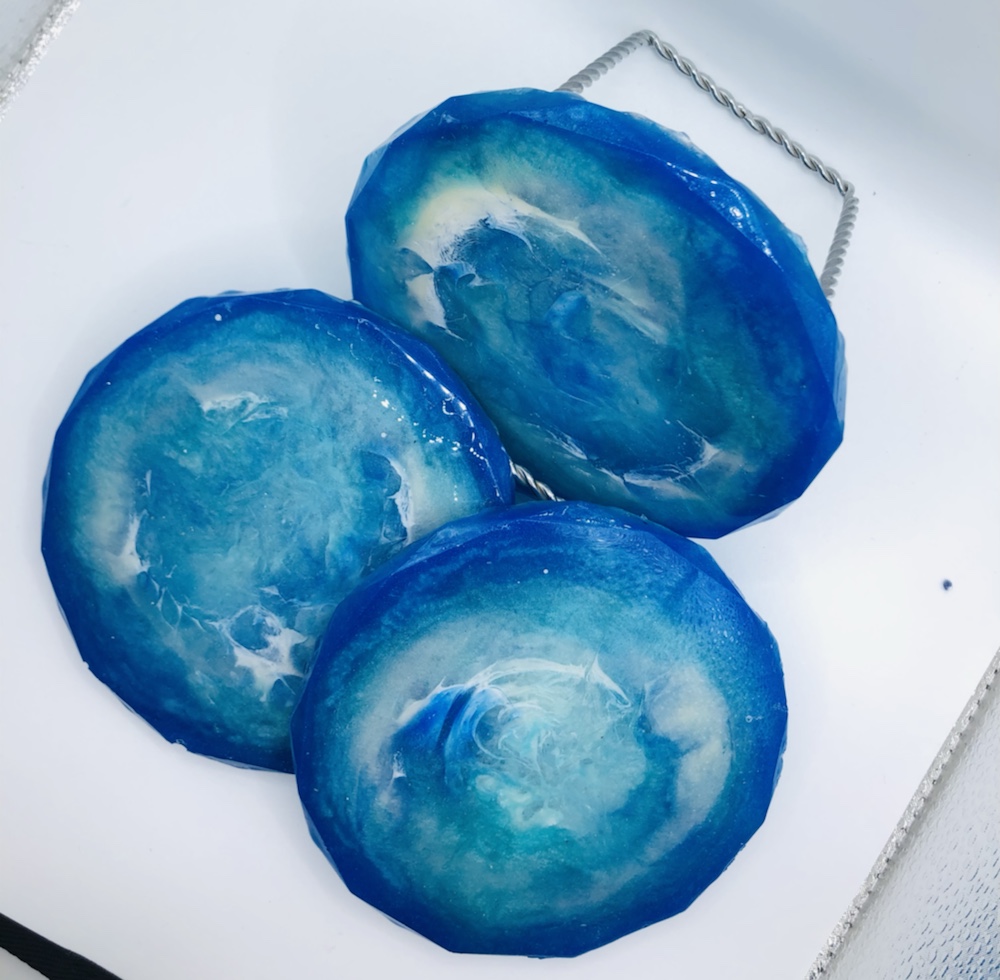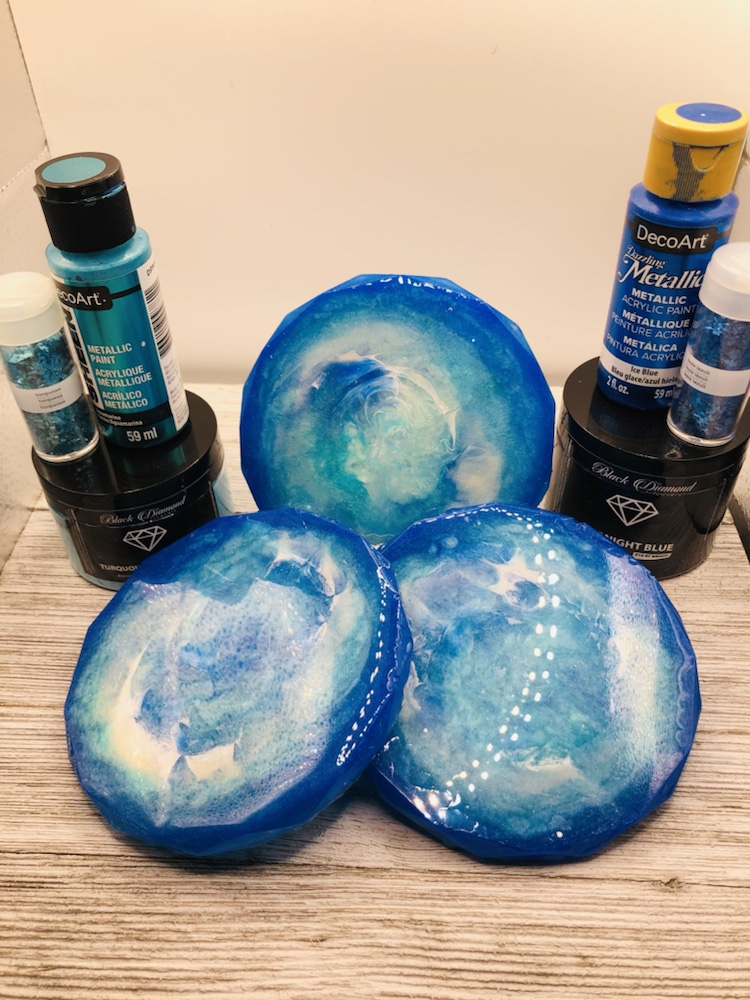 Products used are Deco Art dazzling metallics acrylic paints Ice blue, Aquamarine and Folk Art G75 Champagne Metallic. Mix’s with Art Resin, 4 ounces of resin and 4 ounces of hardener. Other products use are Diamond pigment powder turquoise and midnight blue. I also used Martha Stewart Glitter flakes turquoise and lapis blue. Before you cover for 24 hours make sure you take your heat-gun and pop all bubbles. Then cover for 24 hours, also check within that time for any bubbles coming to the surface. Thank you for checking out my blog. Wishing you guys a wonderful day. Simplycraftydesigns.com by Annalicia Spannaus