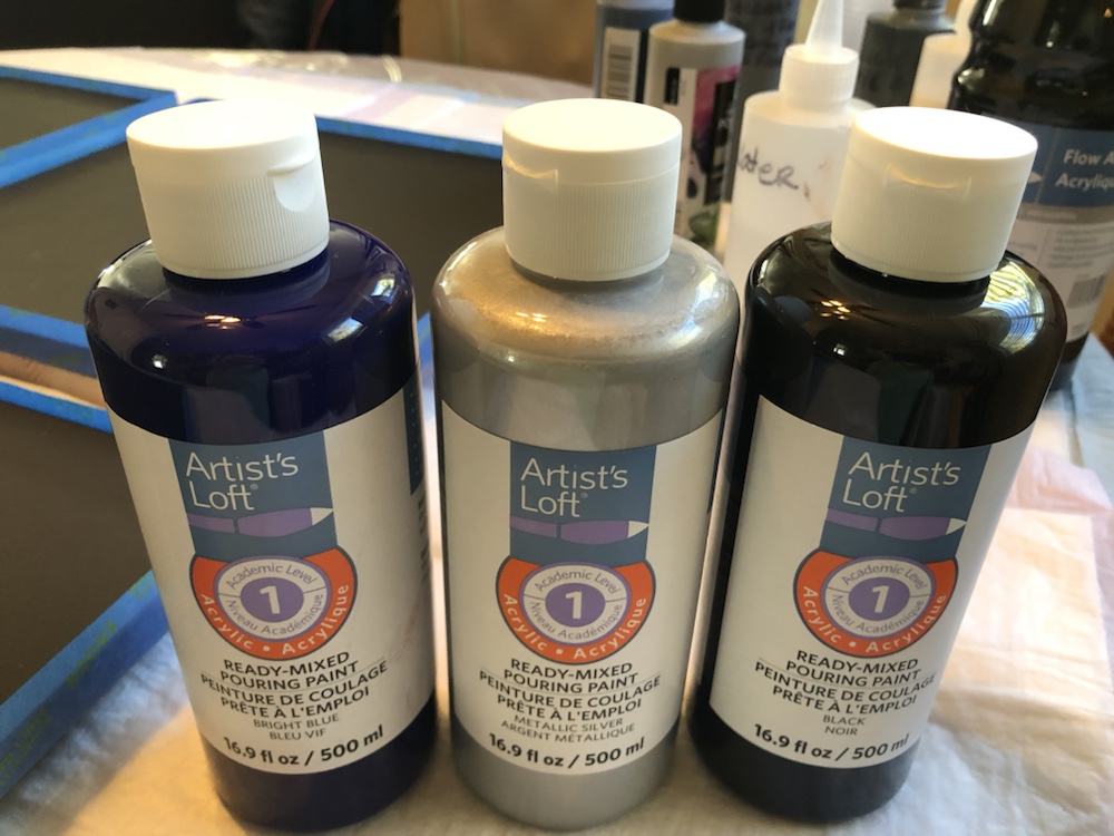 Artists Loft Acrylic paint ready mix pouring paint bright blue, metallic silver, black and white. Also decided to add a couple more colors Apple Barrel True Navy and Gray. I mix my other colors with Golden Color Pouring Medium Gloss.