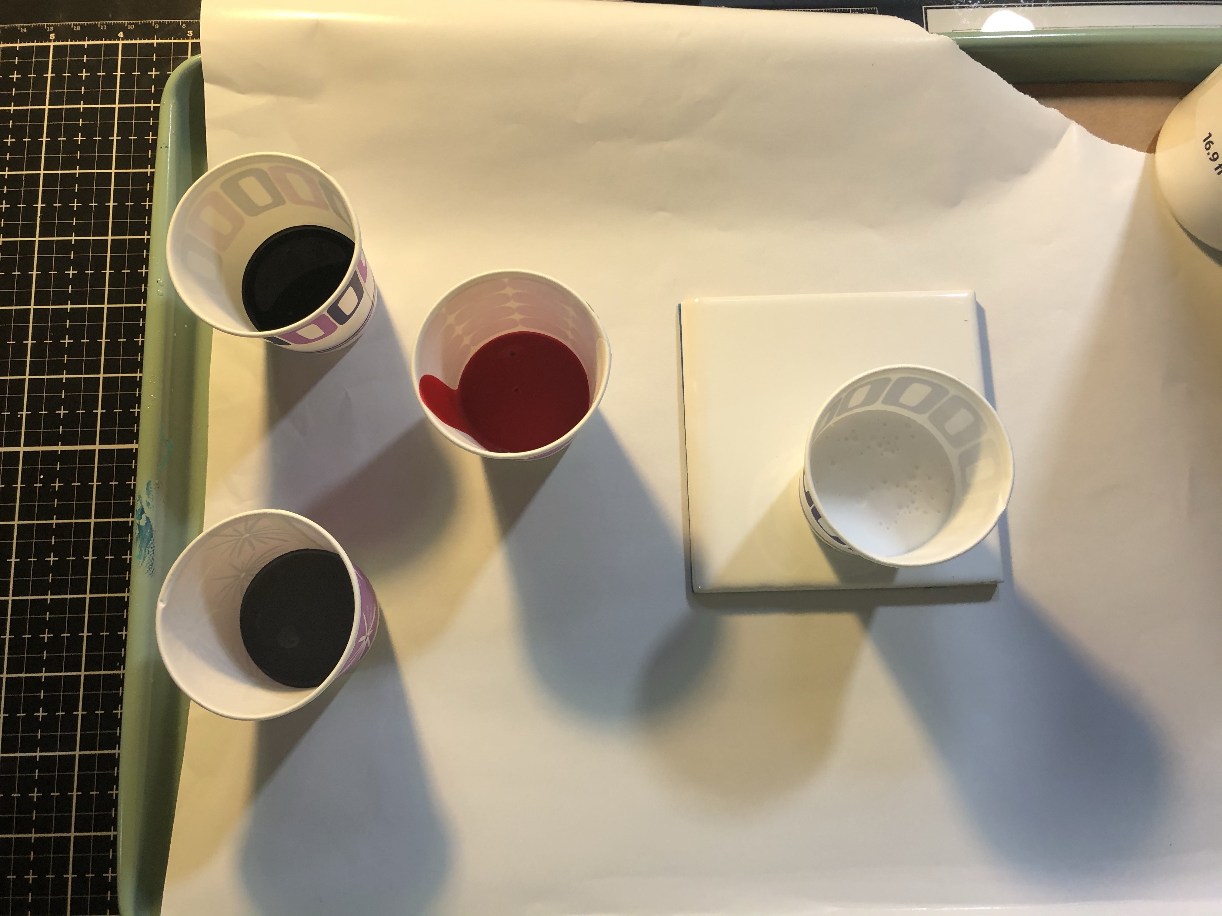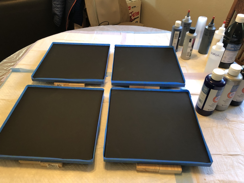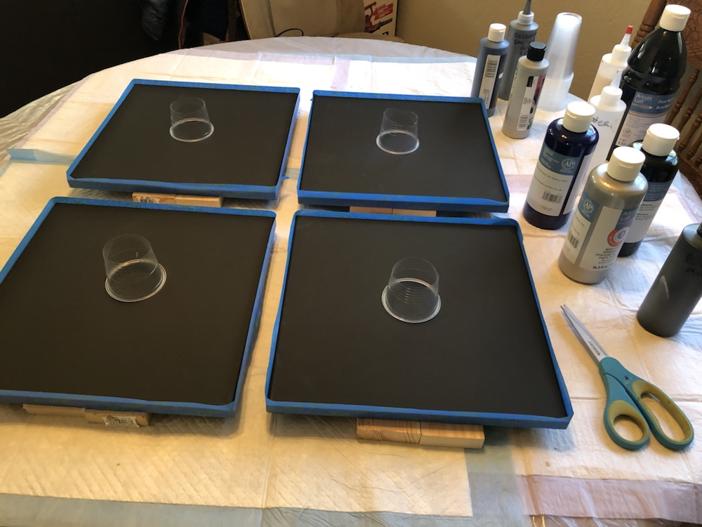 Prep everything first, used four 14×14 black canvas, tape around canvas and cut your cups to size. Pick your colors……