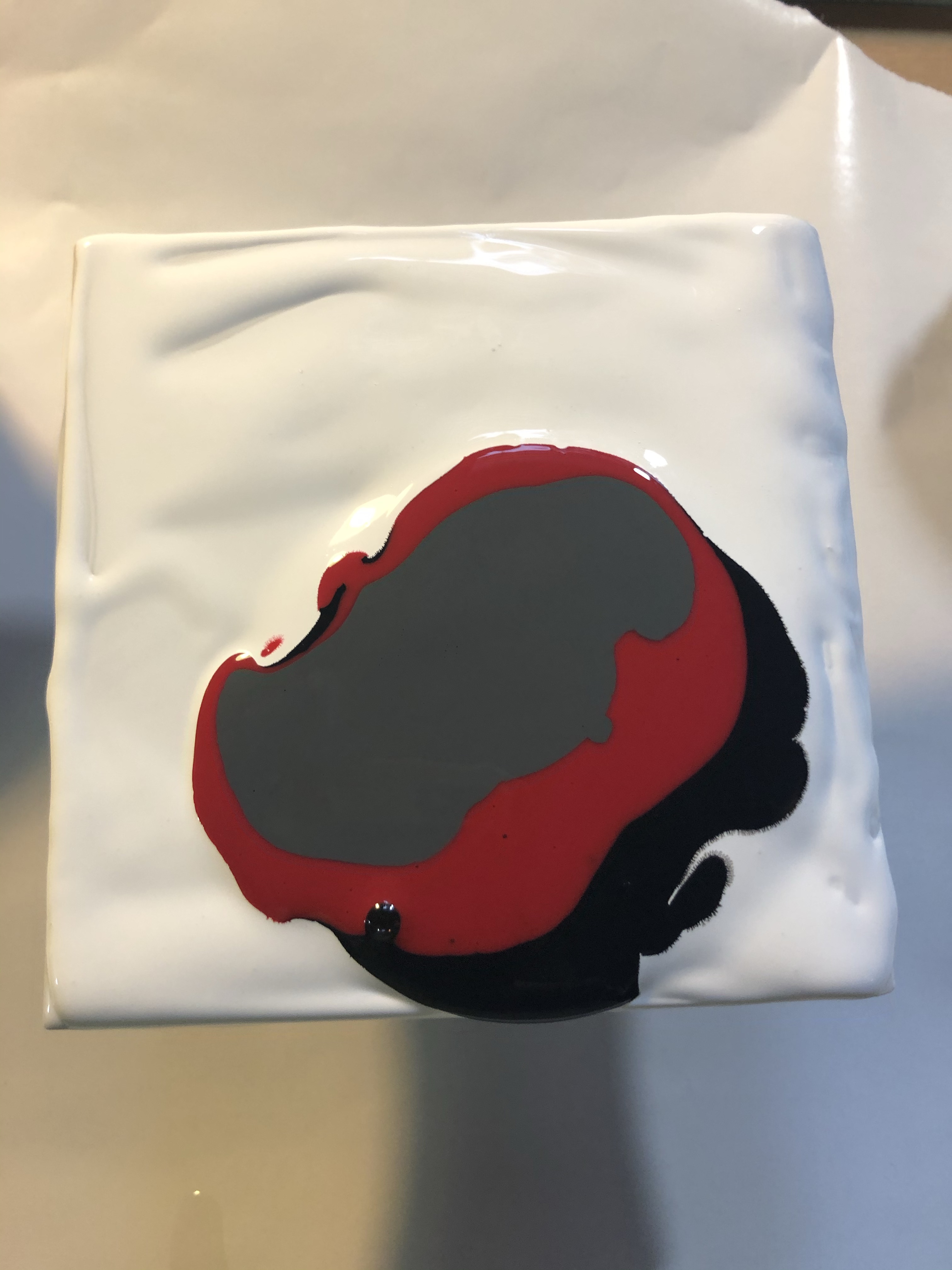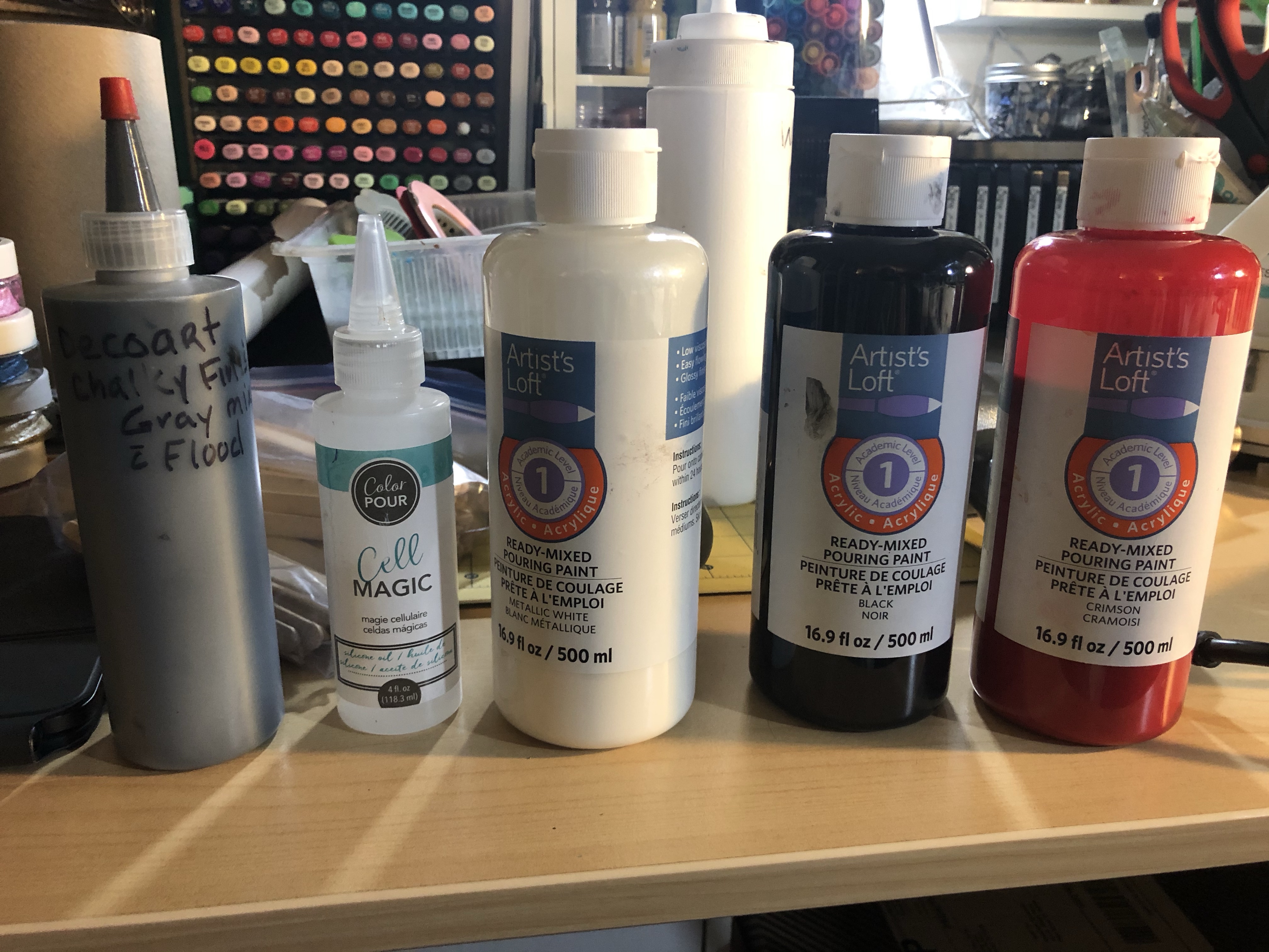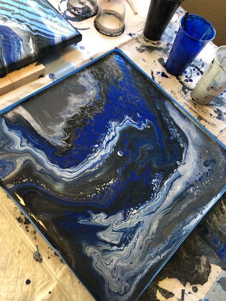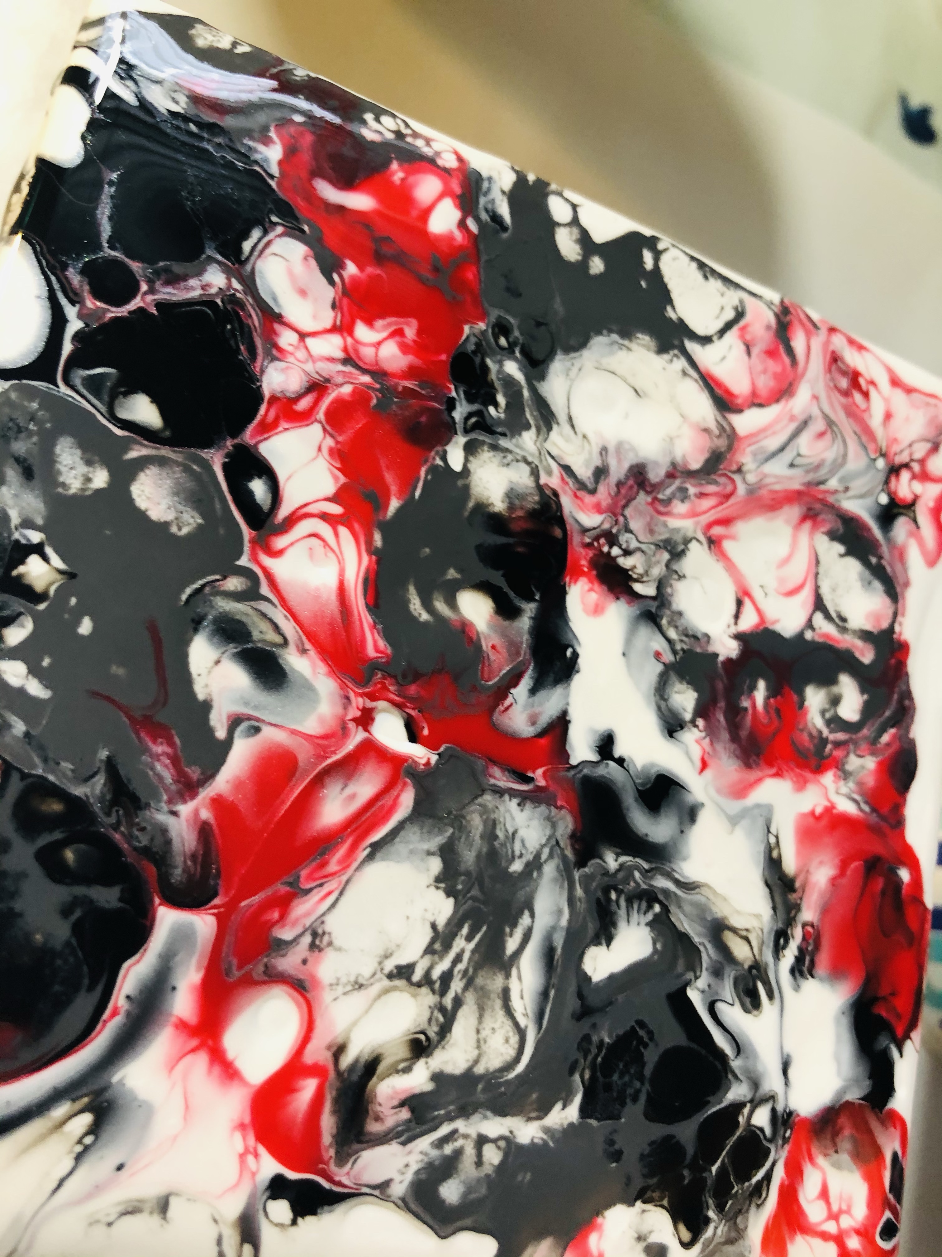 I used Artist’s Loft Acrylic ready mixed pouring paint. Black, Red, Gray and metallic white. I added the Cell magic to only black, red and gray. I first pour the metallic white down. Then I poured the black, red and the gray, then I blew through a straw to move the paint around. Heat gun also to get ready of bubbles. Now I’ll set aside to dry. Then once dry I cover with resin.