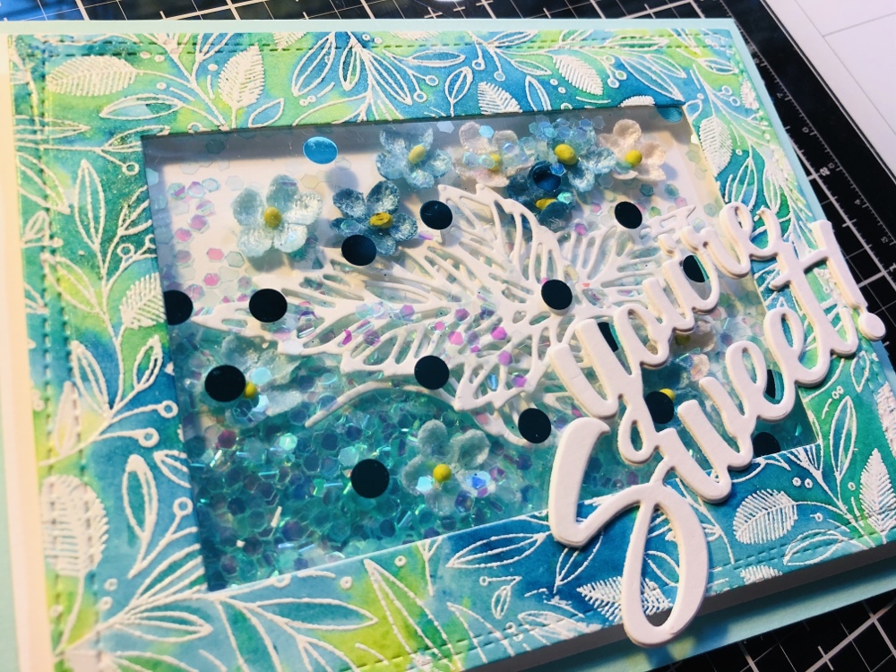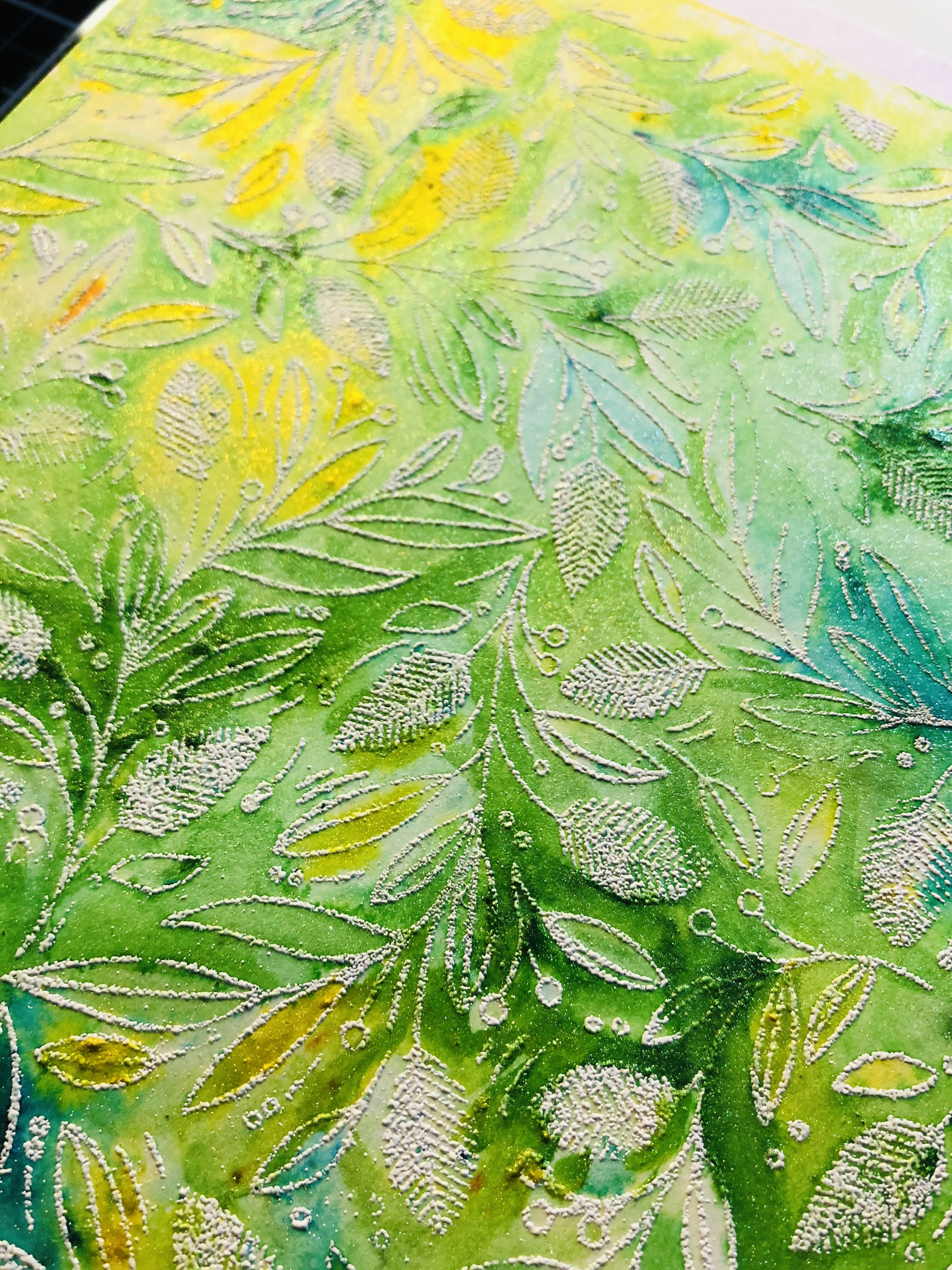 This one I embossed with Ranger Supper Fine Detail Embossing powder Gold. And I decided to only used one color which was Nuvo shimmer powder Catherine Wheel and moved the color around again with my water brush.