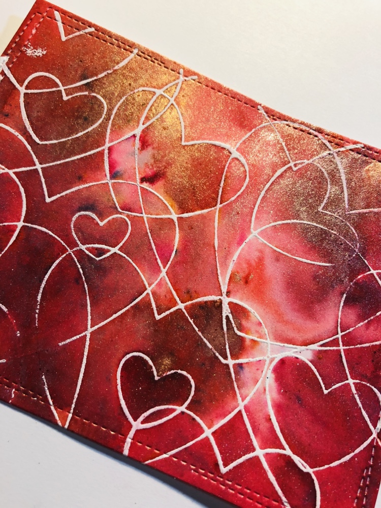 Others products I used are Tim Holtz New Falling Hearts Thinlits 664415, his Kraft-stock Metallic Gold and Ranger Super Fine Detail Embossing powder Gold. I’m so much a fan of all Tim Holtz products.